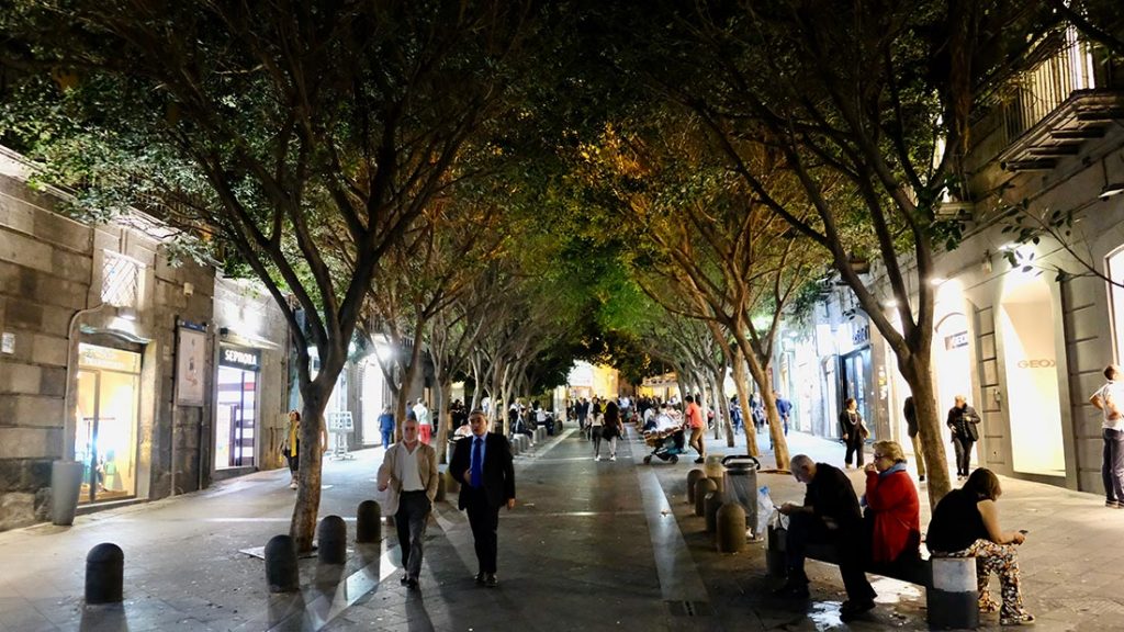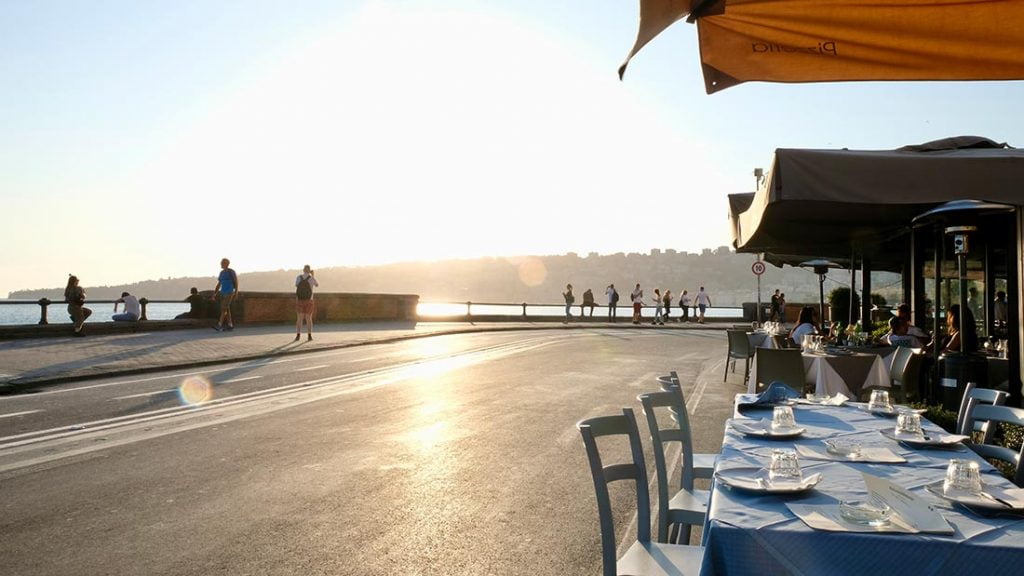 Deler av strandpromenaden er stengt av for biltrafikk, og det virker som et område med mye aktivitet. Vi fikk oppleve et lite marked, en danseoppvisning og et lite tivoli. Og fullmåne, forelskede par, barn som lekte og generell god stemning. Her er det rolig, rikelig med plass og det er åpent ut mot Napoli-bukta, litt i kontrast til resten av byen med dens trange gater og hektiske liv. Det er sikkert derfor veldig mange trekkes ned hit.