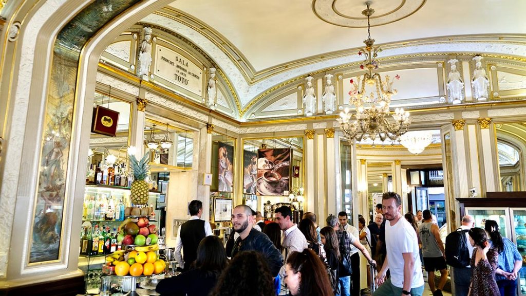 Den siste dagen handlet mest om vår utflukt til vakre Capri. Vi kommer snart med en egen artikkel om den opplevelsen. Men på vei ned til havna der fergene går fra, rakk vi å stikke innom det som ble vår stamkafé: Gran Caffè Gambrinus. Denne kaféen ligger rett ved Piazza del Plebiscito og er som en institusjon å regne. Den ble grunnlagt i 1860 og er stadig like populær. Her er det alltid folksomt, og til tider litt trengsel. Men så fort man forstår systemet, fungerer det ganske greit. Først finner man ut hva man vil ha, så betaler man, deretter henter man det man har betalt for. Det være seg kaffe, juice eller små lekre kaker i alle varianter. For vår del gikk det i espresso, ferskpresset appelsinjuice, cannoli og crostatine alle fragoline – en deilig liten kake toppet med friske markjordbær.