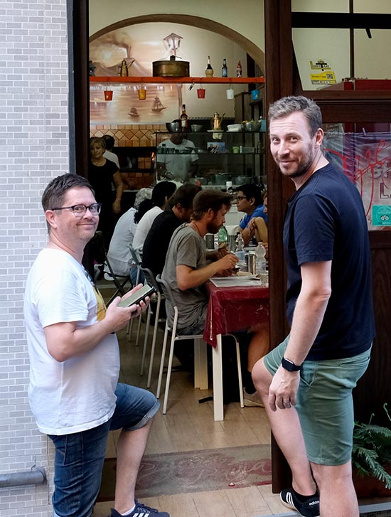 Kent og Magnus i sult og forventning utenfor Pizzeria Pavia.