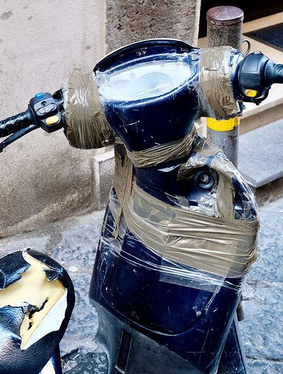 Vårt første møte med Napoli var gjennom bilvinduene fra en taxi på vei fra flyplassen. Vi la spesielt merke til to ting. For det første at det er helt vill vest i trafikken. Det er tilsynelatende ingen gjeldende regler, men tusenvis av biler, scootere og fotgjengere som samhandler som i en slags komplisert symbiose. Jeg vet ikke hva aldersgrensen for scooterkjøring er, men vi så barn som umulig kan ha vært mer enn 12 år, suse av gårde på scooter. Uten hjelm.