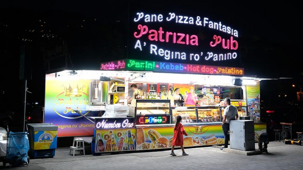 Til drinkene vi bestilte fikk vi såkalt aperitivio, altså litt gratis snacks. I dette tilfellet potetgull, nøtter og en slags små pizzaboller. Vi testet også ut et utvalg småkaker (som man kan få kjøpt over hele byen til alle døgnets tider). En lokal og litt pussig spesialitet er en slags traktformet kake med rom som de kaller «babà». Det føles som den skifter konsistens til flytende når man tygger den, en overraskende og underlig følelse.