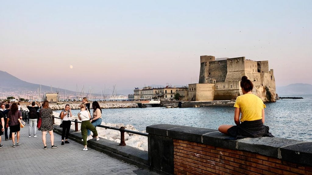 Første kveld tilbrakte vi langs strandpromenaden ved havna. Vi begynte med et besøk i den gamle borgen Castel dell’Ovo. Den ligger på en liten øy som forøvrig også huser en god del restauranter. Det er gratis inngang til borgen og fra toppen er det fin 360-graders utsikt over Napoli, Vesuv, Napoli-bukta og strandpromenaden. Herfra får man et godt inntrykk av byens størrelse. Napoli er Italias tredje største by med ca. 1 million innbyggere.