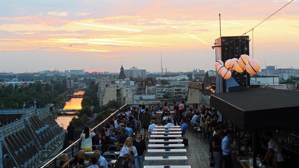 Solnedgang fra en takterrasse i Bucuresti. Foto: Runar Larsen
